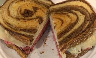 grilled Pastrami, Swiss, grilled sauerkraut, thousand island dressing on rye